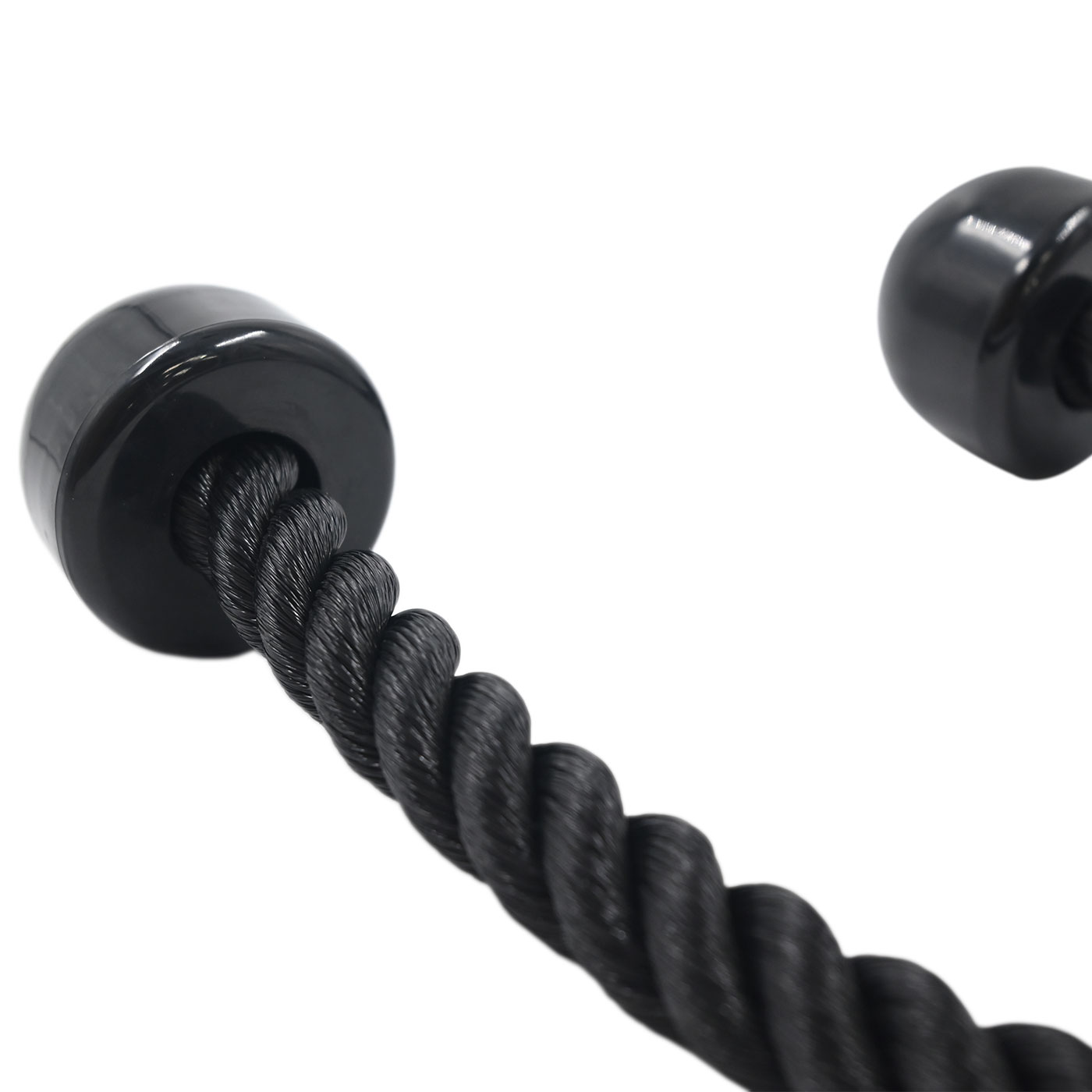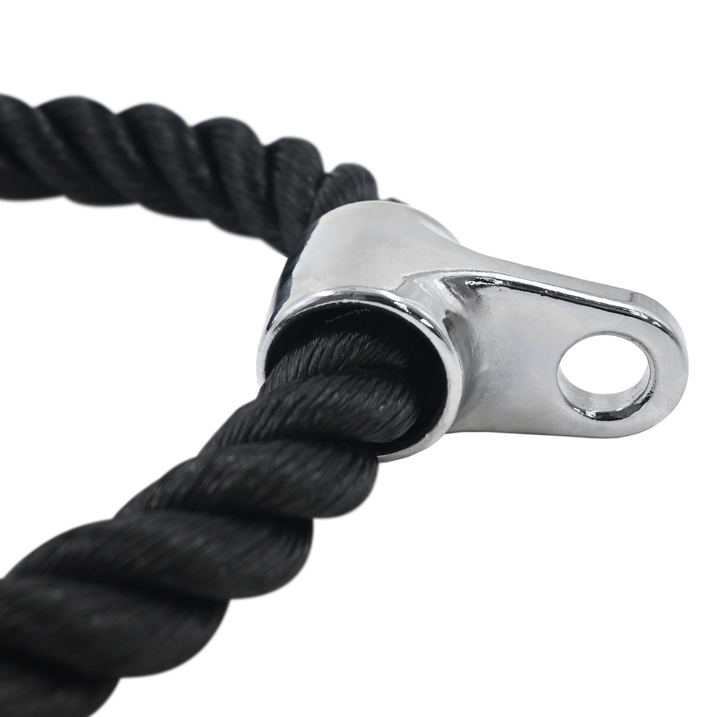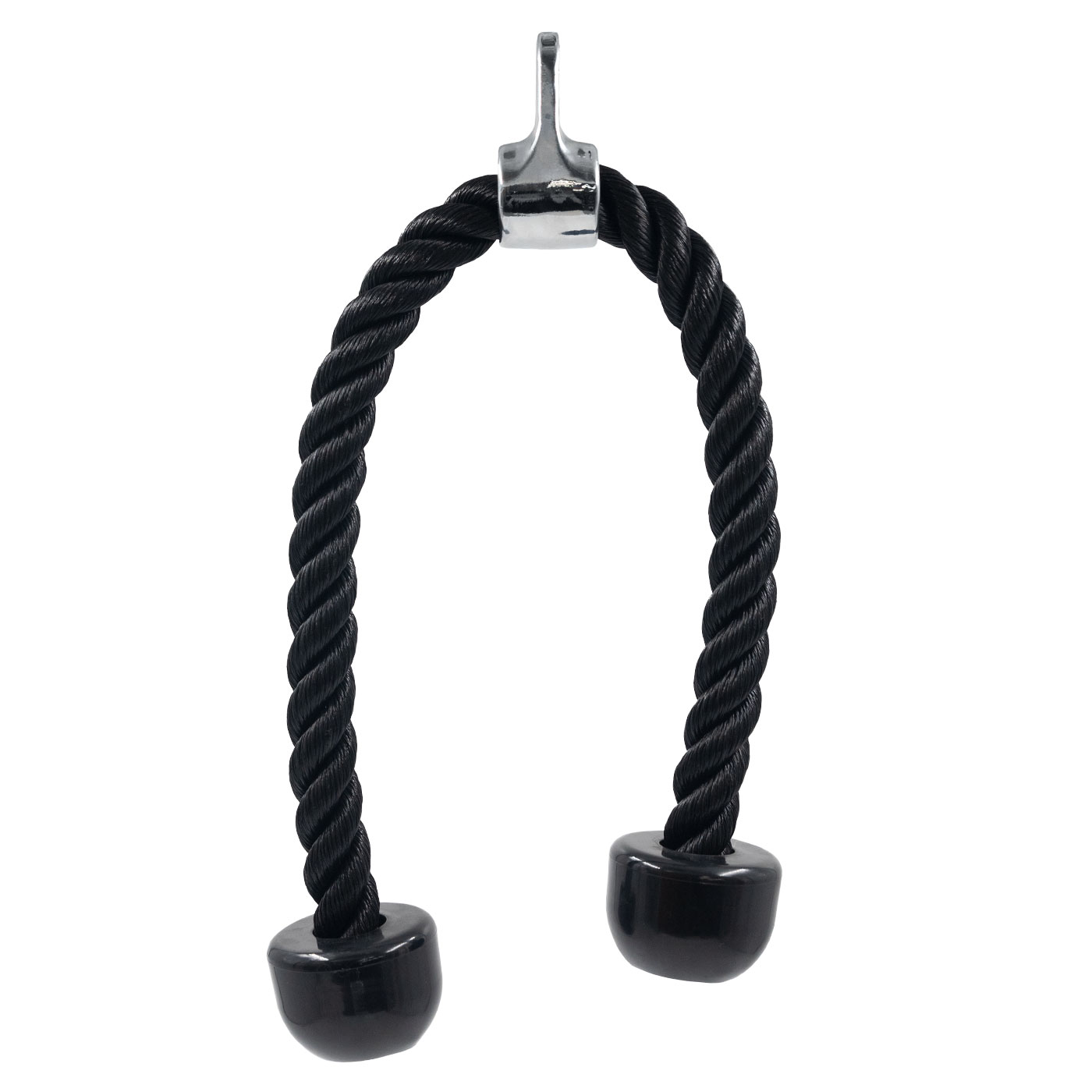 Este lazo tríceps está fabricado con cuerda trenzada de nailon negro resistente. Cuenta con 2 tapones de caucho en los extremos para evitar deslizamientos accidentales y un agarre metálico cromado de fácil instalación a la máquina. Es adaptable a máquinas de poleas como multigimnasios.