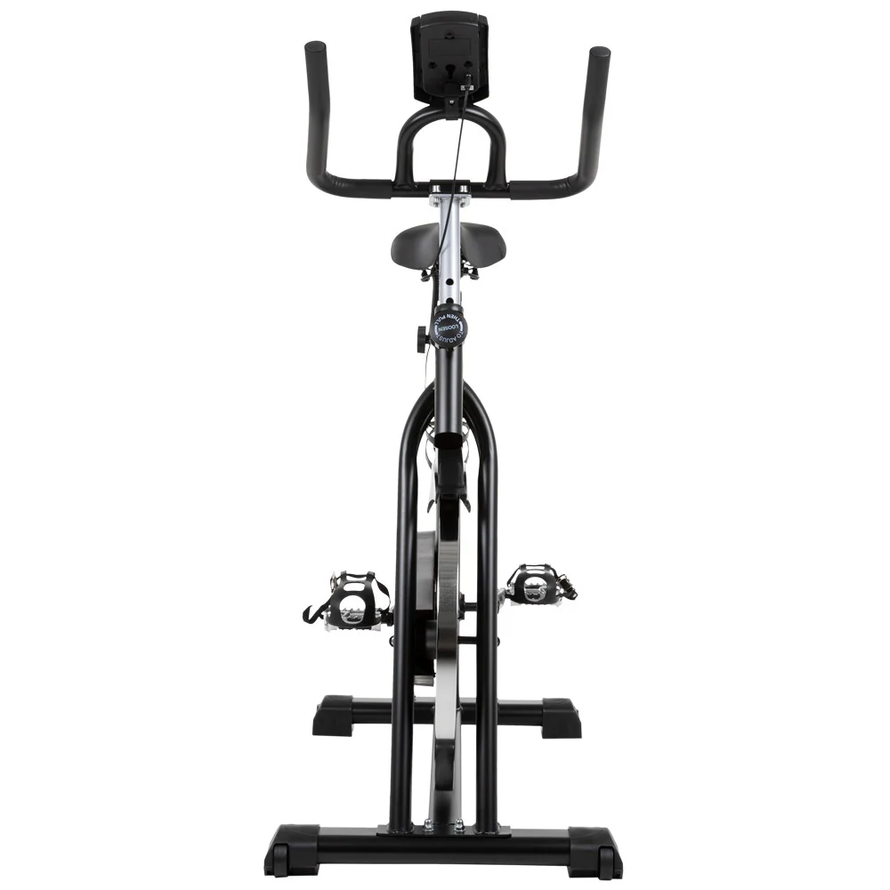 Equipada con un volante de 10 kg, asegura un pedaleo estable y fluido. Su sistema de arrastre por banda mantiene un funcionamiento silencioso, ideal para uso doméstico. Además, cuenta con un monitor digital que muestra datos clave como velocidad, distancia y calorías, lo que facilita el seguimiento del entrenamiento.