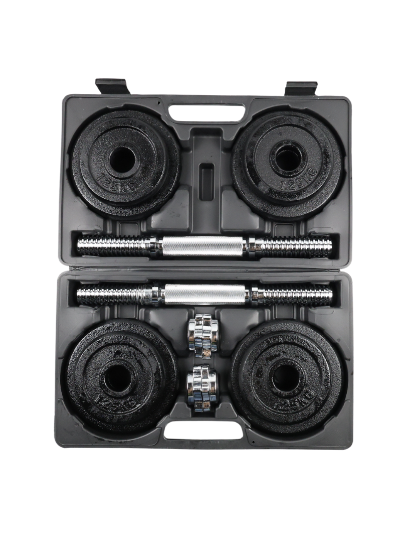 El Kit de Mancuernas 20 kg MD2707 es ideal para tus entrenamientos de fuerza y tonificación. Incluye una barra de 35 cm, discos de 1.25 kg y 2.5 kg, además de collarines para una sujeción segura. Disfruta de versatilidad y seguridad en cada ejercicio.