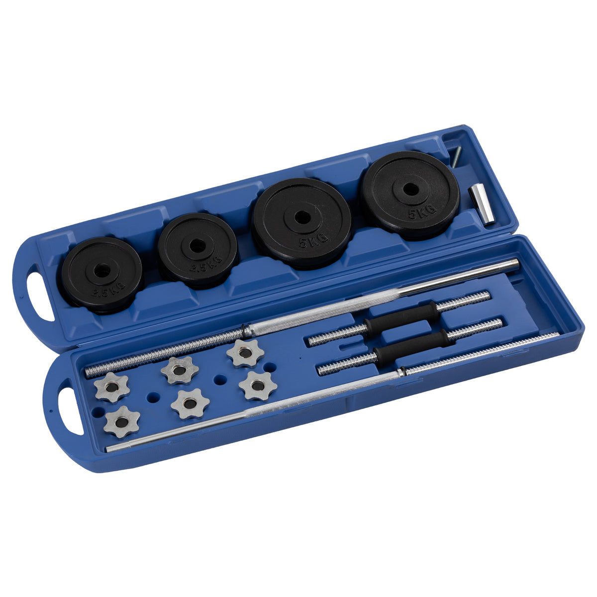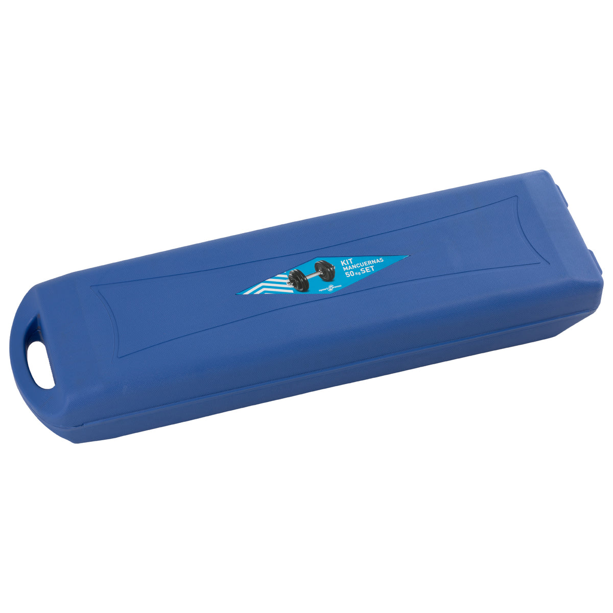 Fabricado con material de hierro resistente, incluye todo lo necesario para un entrenamiento variado y efectivo. Disfruta de la versatilidad de una barra armable de 1.69 cm, dos barras en acero cromado de 35 cm con agarres antideslizantes para una sujeción segura, y seis seguros roscados. Además, el kit viene con una maleta para almacenamiento y transporte, y un set de discos en acero que suman un total de 50 KG, distribuidos en 4 discos de 1.25 kg, 6 de 2.5 kg y 4 de 5 kg.