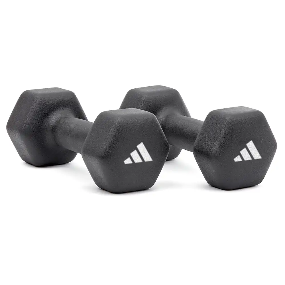 Fortalece y tonifica con las mancuernas Adidas recubiertas de neopreno. Disponibles de 1 a 5 kg, son ideales para movimientos aislados y compuestos.