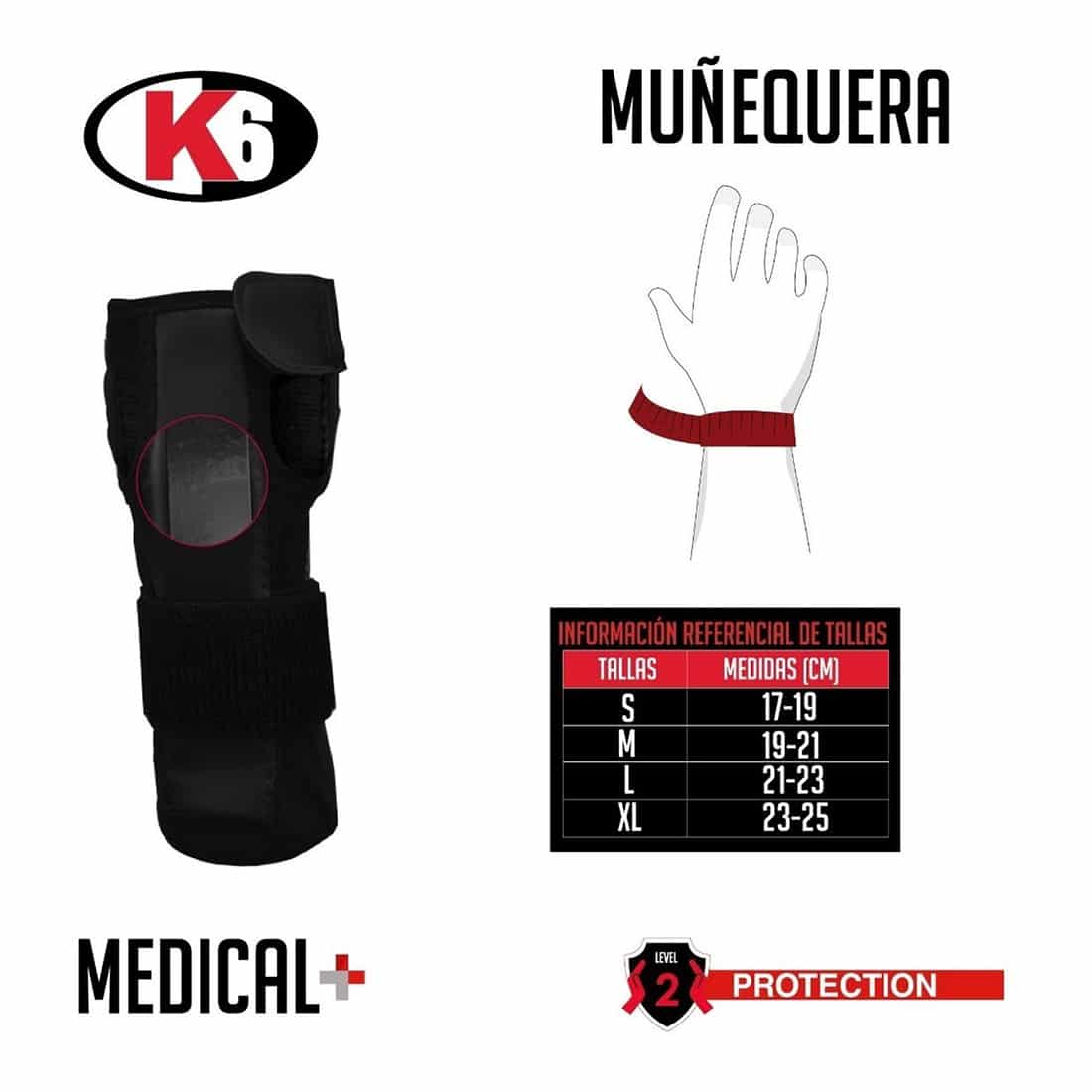 La muñequera k6 K6 Nivel 3 cuenta con un inmovilizador metálico removible extra largo y férulas laterales de 16.5 cm, apta para ambas manos. Sus férulas articuladas de acero proporcionan máximo soporte y una ligera inmovilización, permitiendo el movimiento flexo-extensión. Ayuda a reducir la inversión, eversión y rotación excesiva, previniendo rupturas, desgarros y contracturas.