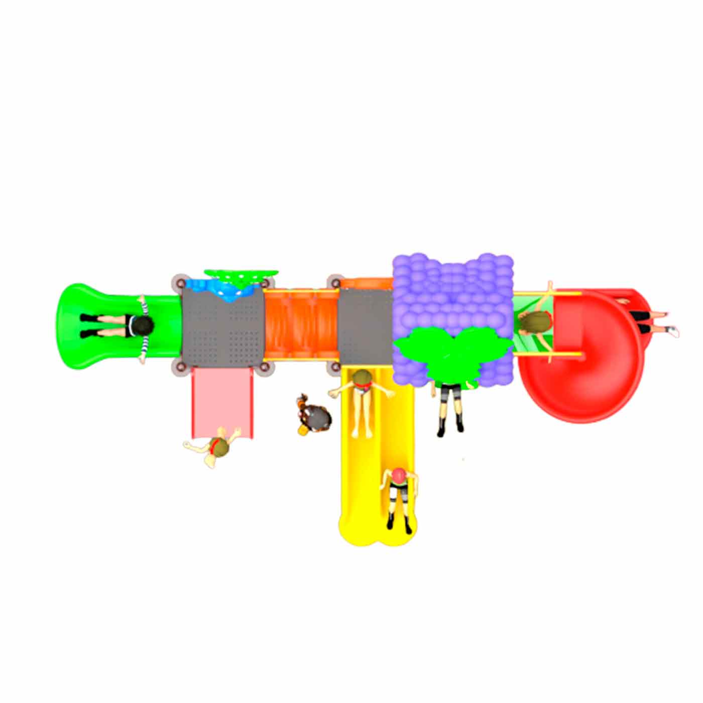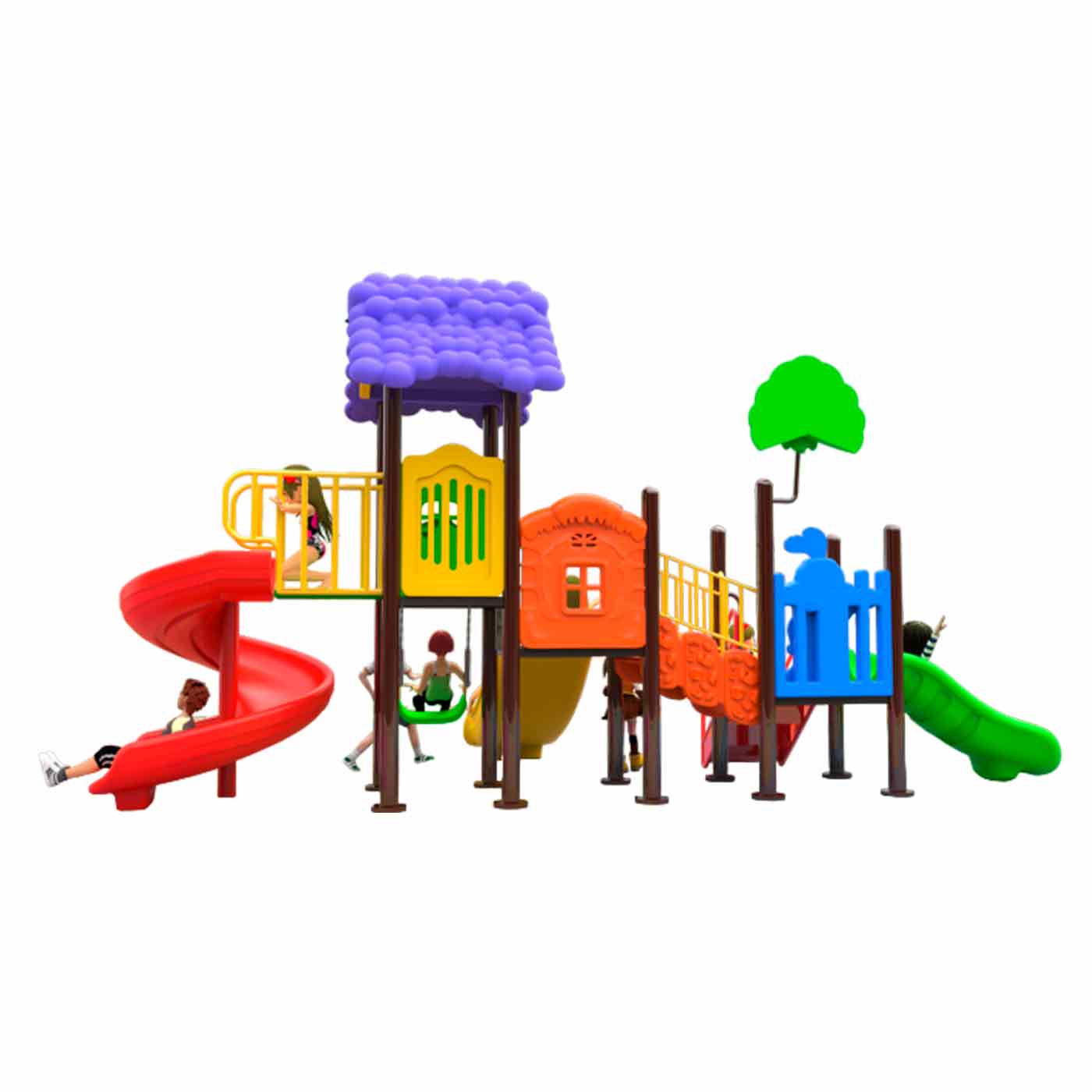 El «Árbol Mágico» es más que una simple estructura: es un lugar lleno de sorpresas. Sus deslizadores curvos, dobles y sencillos, junto con pasadizos de tobogán, invitan a emocionantes descensos y a la exploración de lugares secretos. Con un diseño que evoca la fantasía, permite a los niños de 3 a 8 años vivir aventuras inolvidables, estimulando su creatividad y juego activo. El techo en forma de mora azul añade un toque mágico a esta experiencia única.