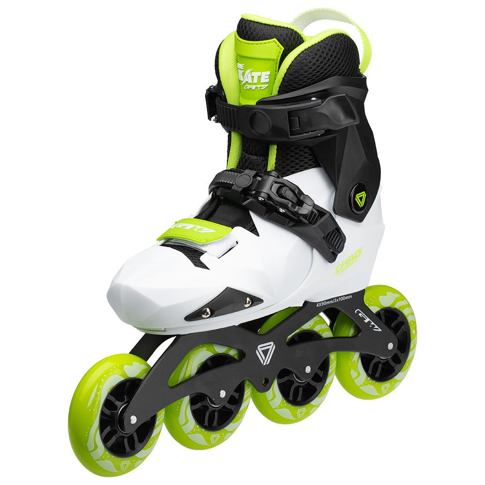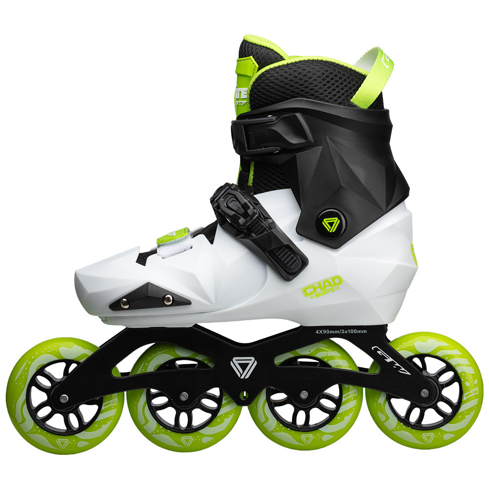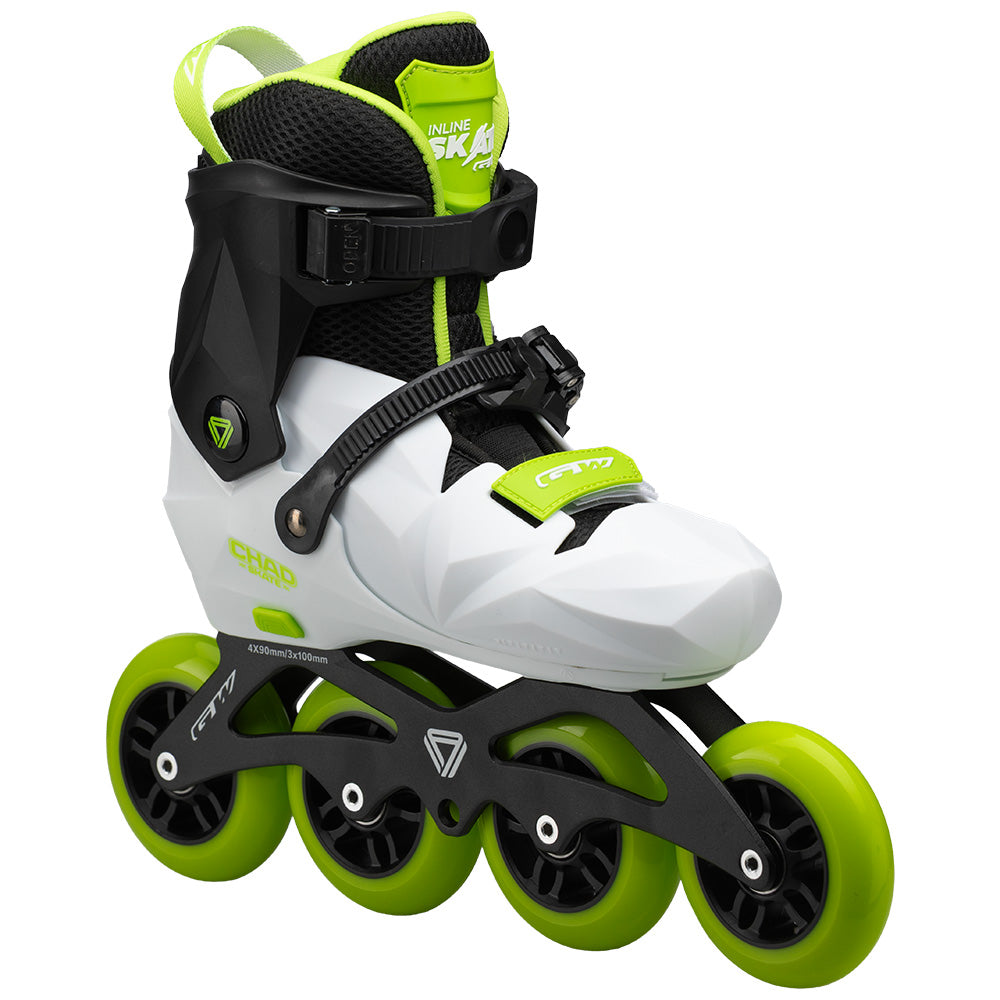 Atrévete a vivir nuevas experiencias sobre ruedas con el Patín Chad Negro Blanco Verde, tu compañero ideal para cada aventura.