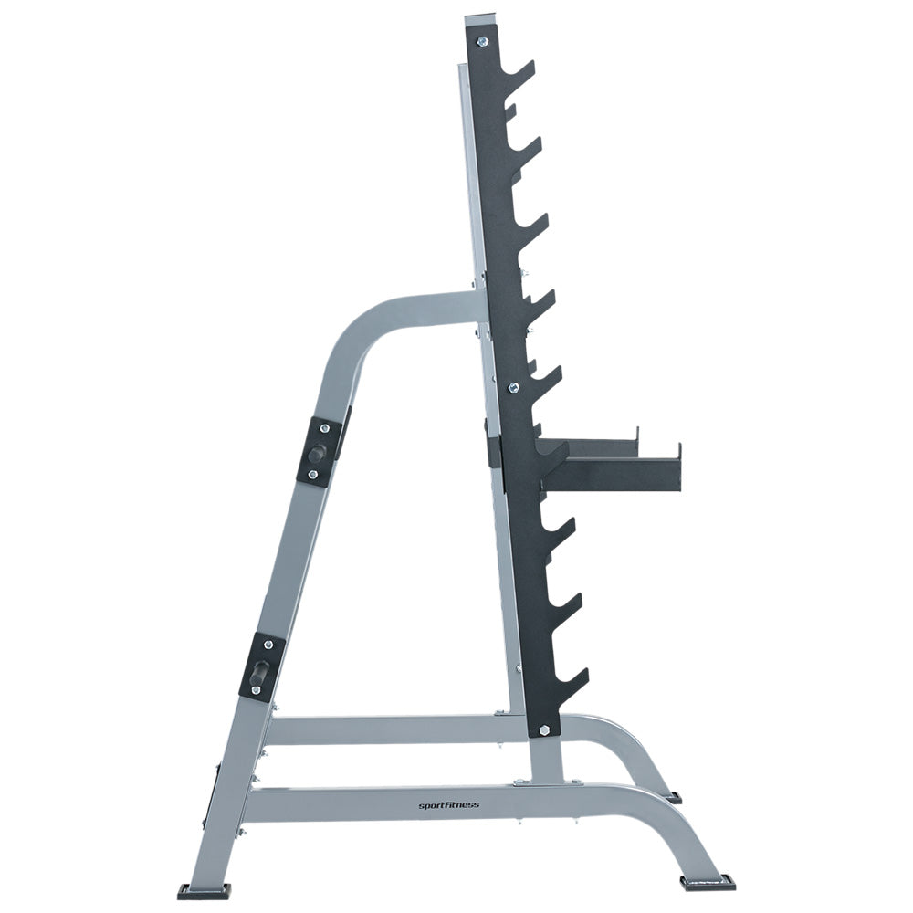Equipado con un soporte de 9 niveles específicamente diseñado para barra olímpica (barra y discos no incluidos), permite una versatilidad excepcional en tus rutinas. Su estructura está fabricada en acero de alta calidad y cuenta con una pintura electrostática, garantizando durabilidad y resistencia al uso continuo. Además, incluye un práctico soporte para discos, manteniendo tu espacio de entrenamiento organizado y funcional.