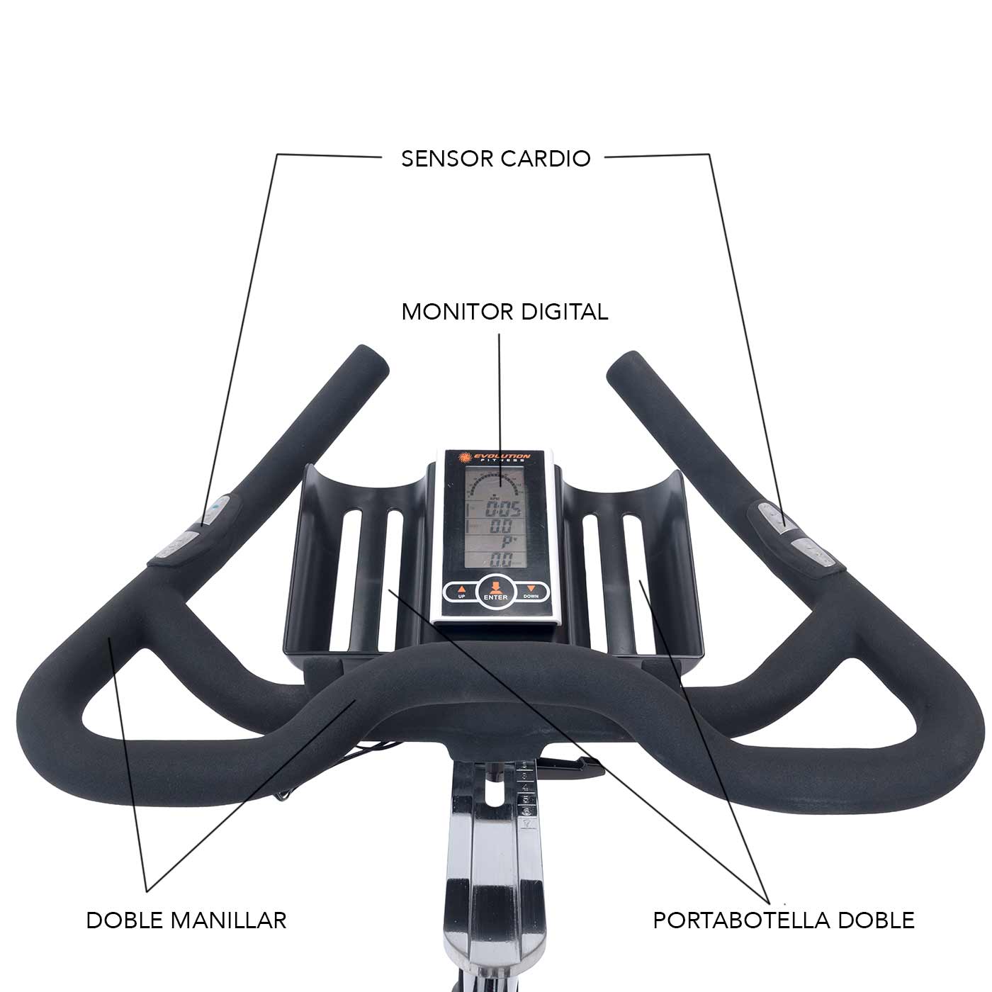 Monitor: Digital que indica tiempo, velocidad, calorías, distancia y pulsaciones.